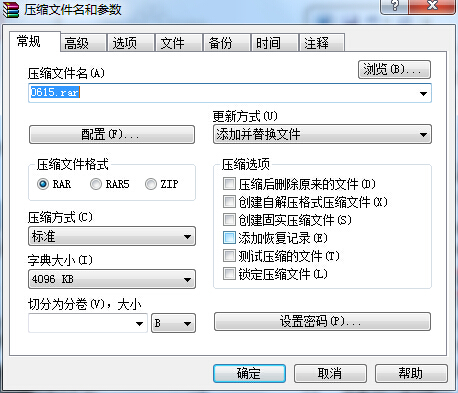 2、 进入压缩文件名和参数界面后,里面有很多不同选项,大家可以根据个人需求进行设置,或者可以保持默认,直接点击确定开始压缩文件处理。