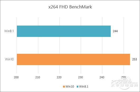 从测试结果来看,Win8.1在x264 FHD BenchMark测试中较Win10更快一些,少用时9秒,提速约3.5%。