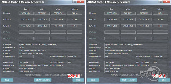 小结:从最终结果来看,Win10的内存占用要明显大于Win8.1,尤其是5分钟后的自动回收情况远不及上一代产品。从内存基准测试来看,Win10仅在“内存写”(Memory Write)这一项上略强于Win8.1,其余项目(Memory Read、Memory Copy、L1 Cache、L2 Cache)均呈现近似或不同程度的变慢。也就是说在内存实际利用率上,Win10并不及它的老前辈——Win8.1。