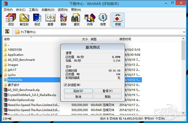 小结:WinRAR内置了一项简易的压/解压缩测试模块,支持多线程,可以方便地对CPU多线程及内存性能做一个评估。从测试结果来看,Win10的结果还是比较理想的,基准数据比Win8.1高出约13个点。