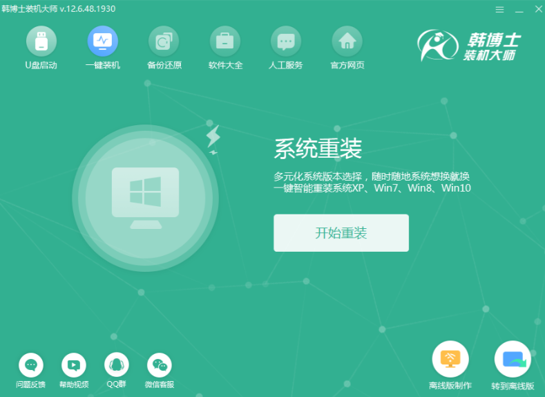 1.打开下载好的韩博士装机大师,如果没有下载请先到韩博士官网下载软件,然后单击【开始重装】。
