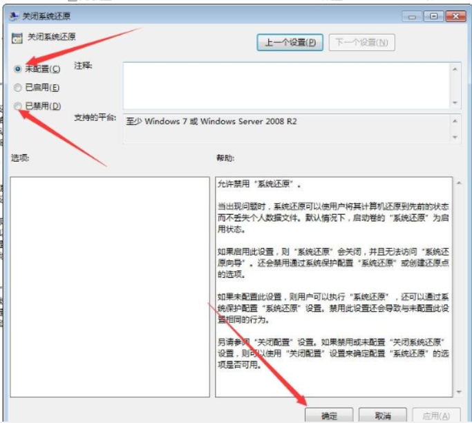 3、在关闭系统还原窗口中,选择未配置或已禁用,点击确定后重启电脑即可开启还原功能,这时就可以正常还原系统了。
