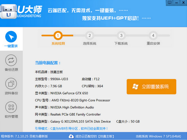 3、完美兼容各种机型;U大师一键重装系统官方版同时也是唯一解决笔记本自带win8系统的UEFI+GPT格式下安装其它windows系统的工具。