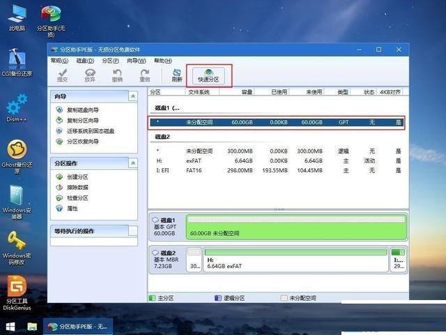 1、进入到pe之后,如果之前已经是预装win10机型,直接执行第9步,如果需要全盘重新分区,则双击桌面上的【分区助手(无损)】,选择磁盘1,点击【快速分区】,如果你是多个硬盘,要选对,不要误删;