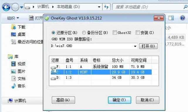 2.将Win7.Gho文件与OneKey Ghost工具放到相同一个目录,比如D磁盘,不可以放一个C盘或是桌面。