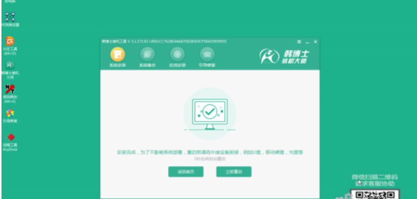 6、安装部署完成后,选择立即重启。重启电脑选择韩博士PE模式进行安装。