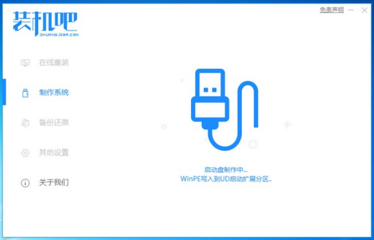 1、下载安装装机吧一键重装系统软件并打开。准备一个8GB以上的U盘。选择制作系统,在制作U盘中选择您的U盘,其它参数默认,点击开始制作。