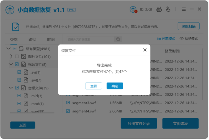 3、数据扫描完成后,选择需要恢复的文件类型,点击立即恢复。