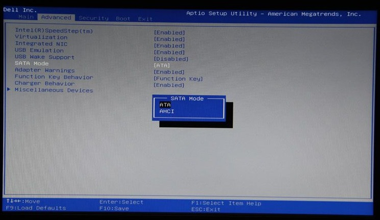 2、进入戴尔笔记本bios设置后,大家需要先将这个硬盘模式更改下。通常情况下dell笔记本默认的是AHCI模式。不过这样的模式一般装系统可能都会出现不认硬盘或者蓝屏的现象,那么为了保证万无一失,大家选择ATA,这个也就是常说的IDE模式。大家在进入BIOS后,切换到Advanced(高级)选项,接着找到SATA MODE,然后大家用键盘操作选择ATA,并且回车就行了。