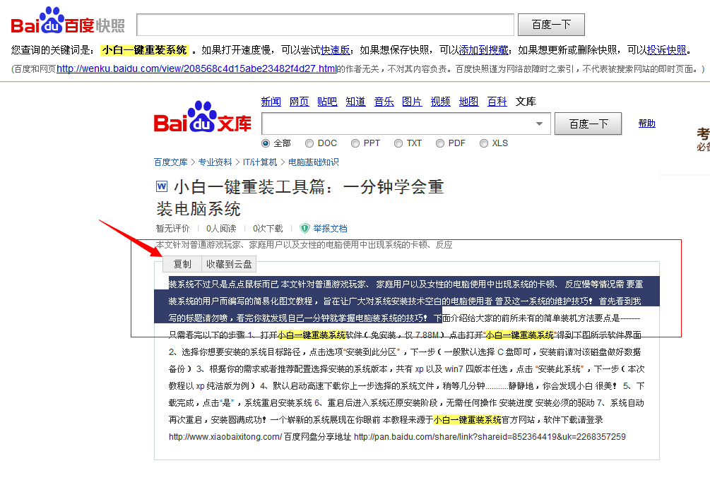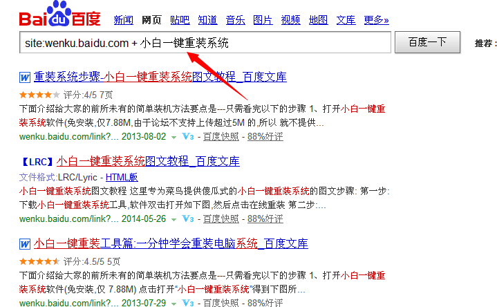1.直接百度搜索 site:wenku.baidu.com+搜索内容的标题,例如:site:wenku.baidu.com + 小白一键重装系统