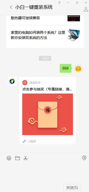 2、发送 “888”,获取红包参与入口。