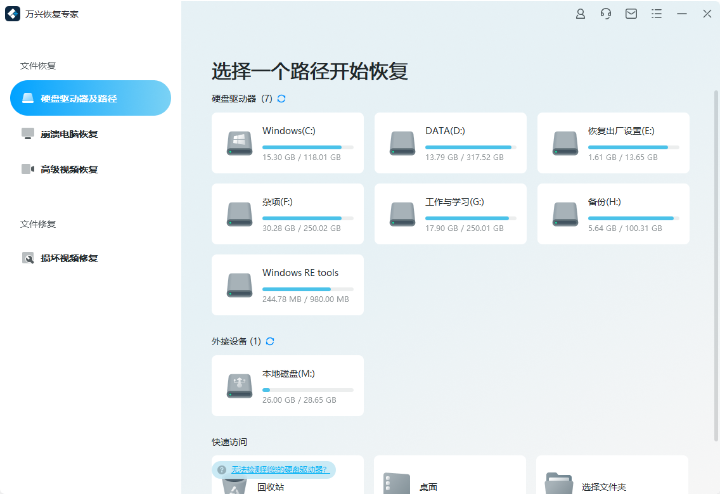 这是一款专业高效安全的数据恢复软件,支持300种以上不同格式的文件恢复,覆盖电脑、硬盘、U盘、SD卡等在内的几乎所有数据存储设备数据丢失场景,特别是误删数据恢复和格式化数据恢复,全新上线的高级视频恢复和视频修复功能可以帮助视频拍摄爱好者提供视频修复方案。