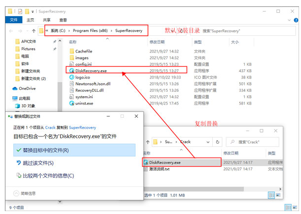 5、先把Crack文件夹中的DiskRecovery.exe文件替换到默认安装目录中。默认安装目录为【C:\Program Files (x86)\SuperRecovery\】