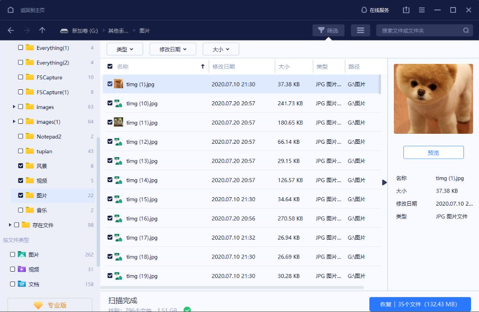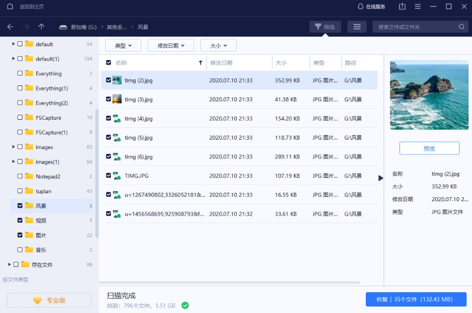 3、预览和恢复移动硬盘资料。