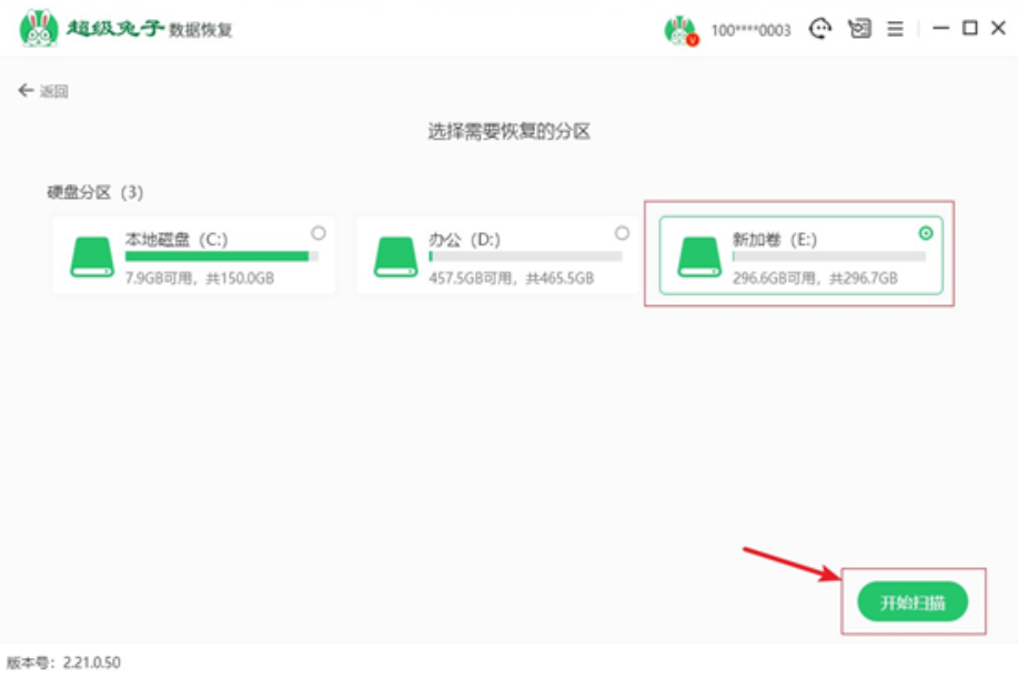 3、接着选择格式化了的硬盘,比如E盘,选择后点击【开始扫描】。