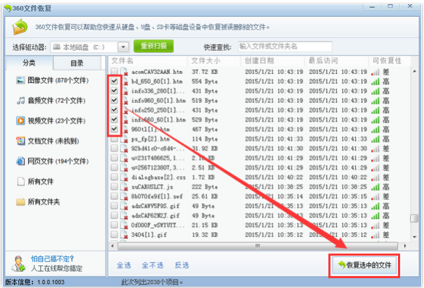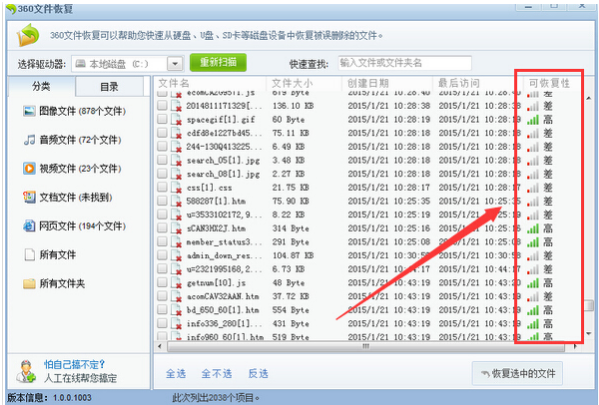 4、扫描完成之后360文件恢复功能会显示丢失文件的情况,我们在这可以看到可恢复性分为几个级别,我们可以选择想要恢复的文件尝试进行恢复。另外还有一种是文件夹可恢复性为空白的,这个文件夹是可以恢复的,不过文件夹内部的文件可能已经被擦写,文件夹恢复后不一定能够找到自己想要的文件。
