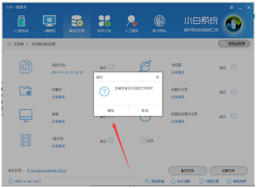 3.弹出询问提示框,点击【确定】进行勾选的文件备份。
