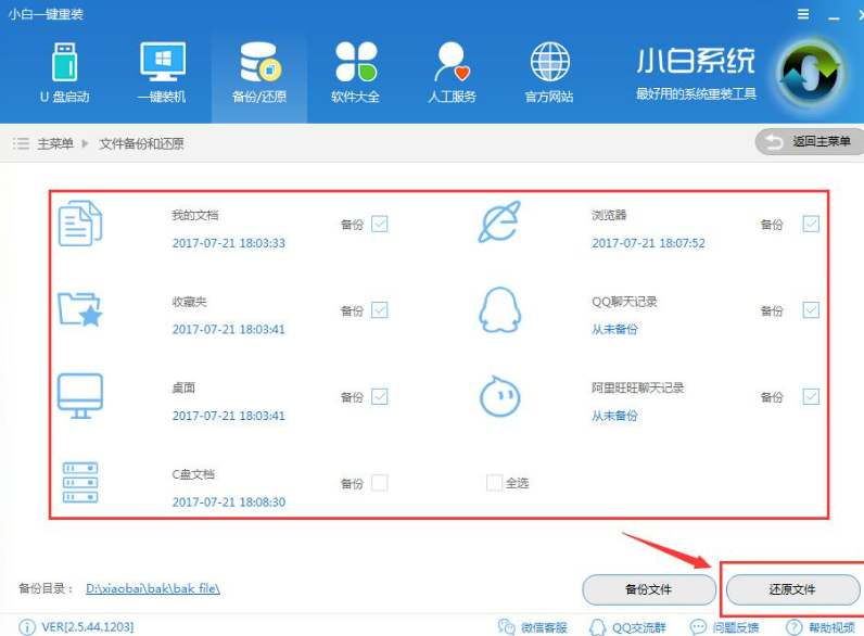 2.除了【我的文档】、【收藏夹】、【桌面】,小白的重要备份选项中还多了【C盘文档】、【浏览器】、【QQ聊天记录】、等几项,文件备份更加全面,勾选需要备份的选项,点击【备份文件】。