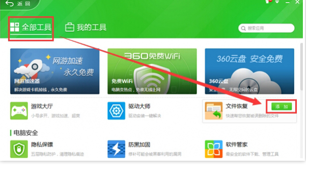 2、点击所有工具,窗口界面中寻找文件恢复,点击添加。