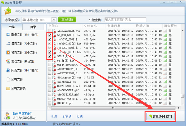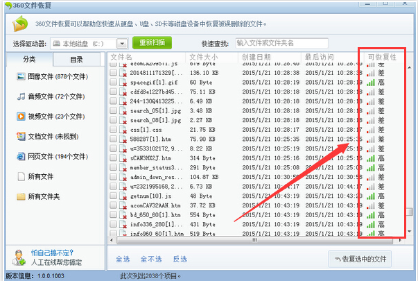 4、扫描完成之后360文件恢复作用将会显示遗失文件的状况,大家见到可恢复性分成很多个等级,大家可以选择自身要想恢复的文件试着开展恢复。此外也有一种是文件夹是可恢复性为空缺的,此文件夹是可以进行恢复的,不过文件夹内部结构的文件很有可能已经被可读写,文件夹恢复后不一定能寻找我们需要的文件。