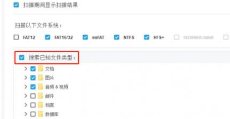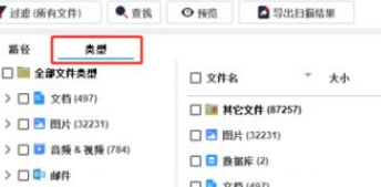 扫描完成后,所有数据在“类型”的分类下,按文档、图片、音频&视频、邮件、档案、数据库和其它文件归类,方便用户查找某一种类型的丢失数据。