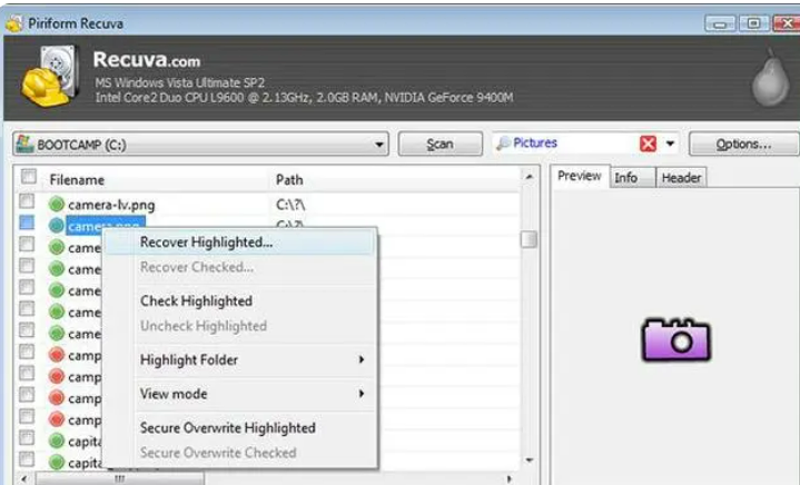 Recuva是一款Windows平台下的文件恢复软件,可以恢复误删的任意格式的文件,同时可以恢复硬盘、U盘、内存卡等等设备的文件,只要没有重复写入数据,无论如何格式化都可以进行恢复。