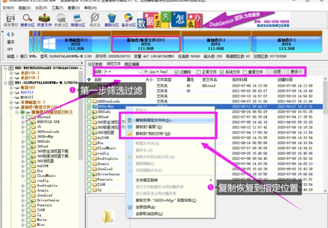 3、搜索完成进行文件类型等的过滤,找到需要恢复的数据文件,然后鼠标右击复制到指定位置。