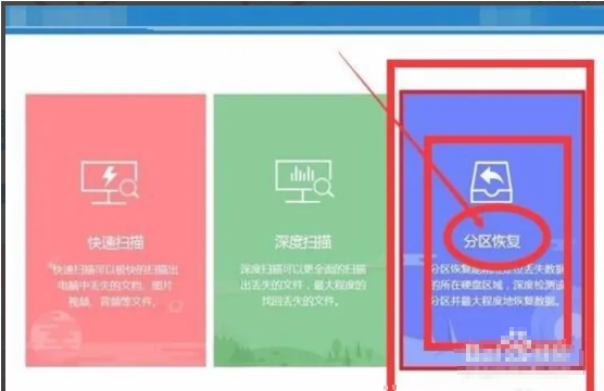 2. 进入软件页面将会看到三种选项:快速扫描、深度扫描、分区恢复选项,每个选项会有对应的工具具体描述,我们可根据实际情况选择合适的进行操作,选择分区恢复选项。