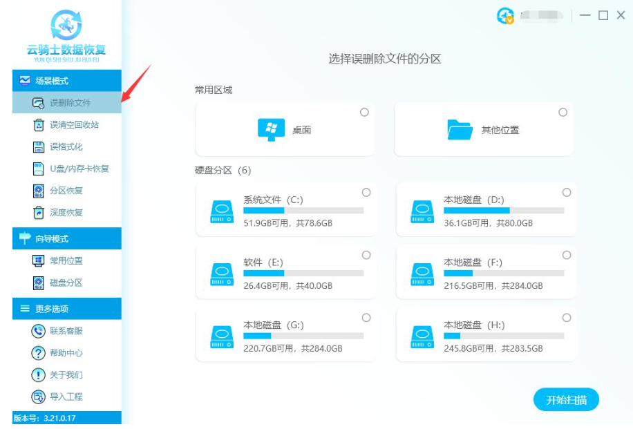 以云骑士数据恢复软件为例,打开软件操作界面,选择“误删除文件”选项。