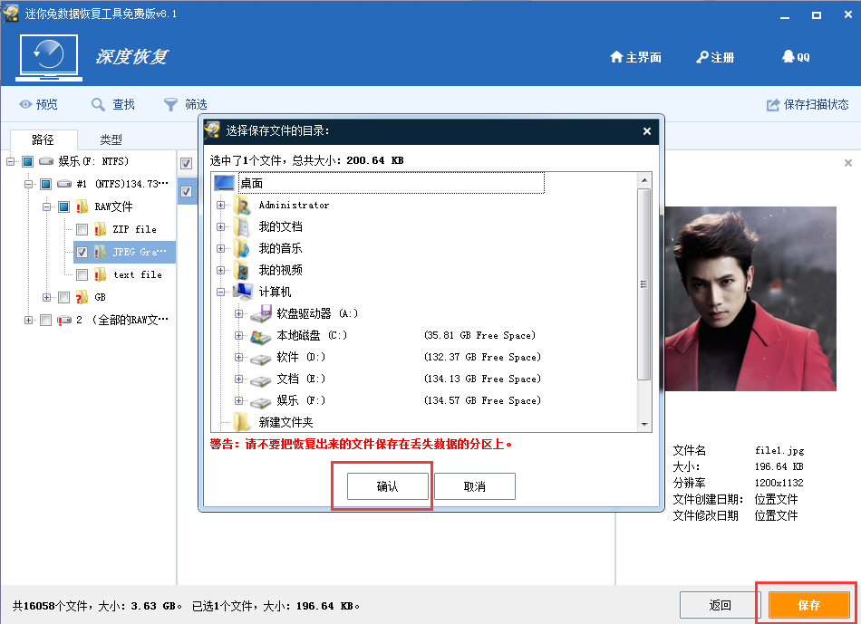 3、等待扫描结束,在丢失数据的列表中手动勾选需要恢复的数据然后保存到安全磁盘中,回收站被清空的数据就恢复出来了。