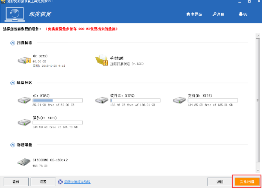 鼠标点击数据之前保存的磁盘位置,对这个磁盘进行“完全扫描”。