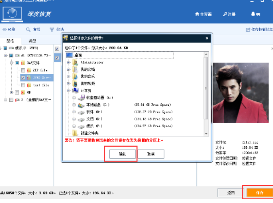 3、等待扫描结束,在丢失数据的列表中手动我们勾选我们需要恢复的数据,保存到安全磁盘中,回收站被清空的数据就成功恢复出来啦。