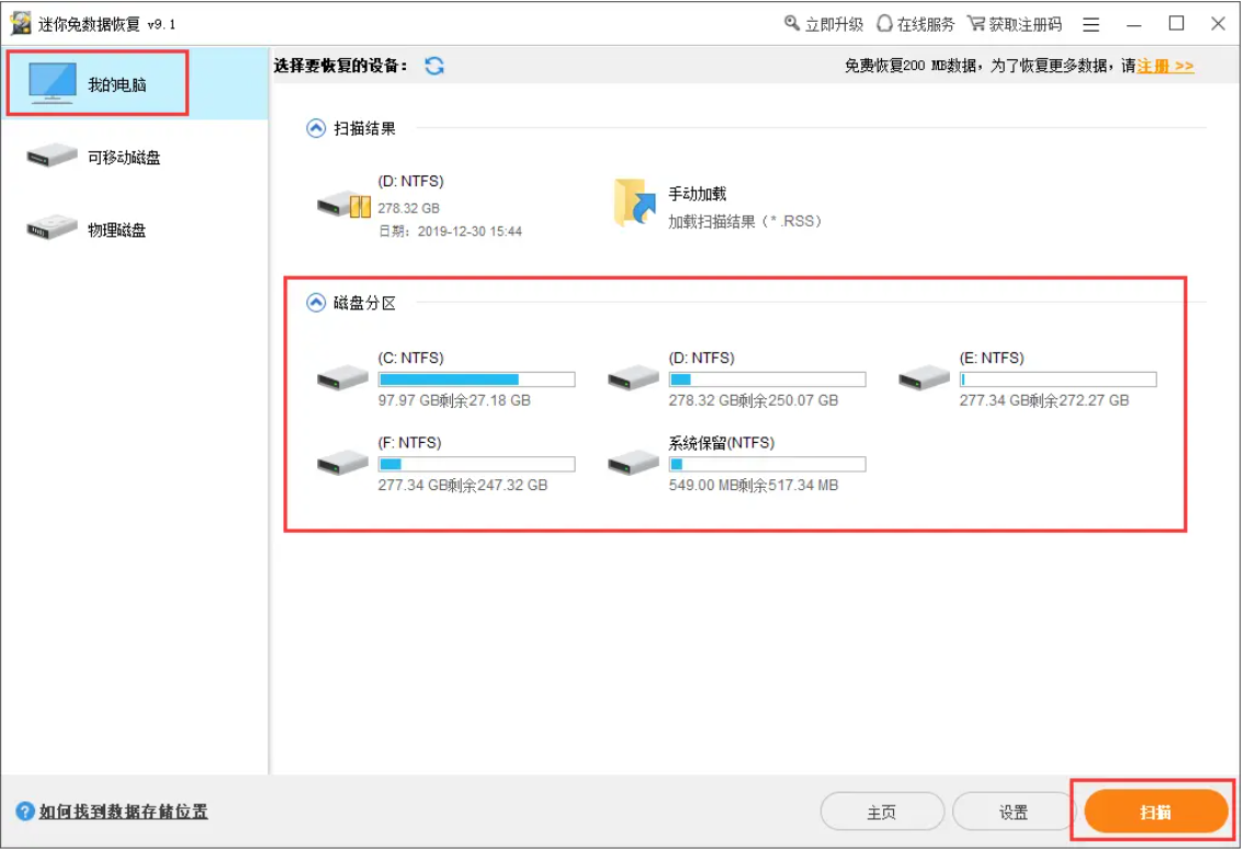 2、进入数据恢复选择界面,这里会显示所有可以进行恢复的分区。比如我们要恢复电脑D盘上的数据,点击左侧【我的电脑】,然后在右侧选中【D盘】,之后点击界面右下方【扫描】。