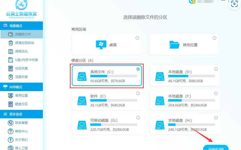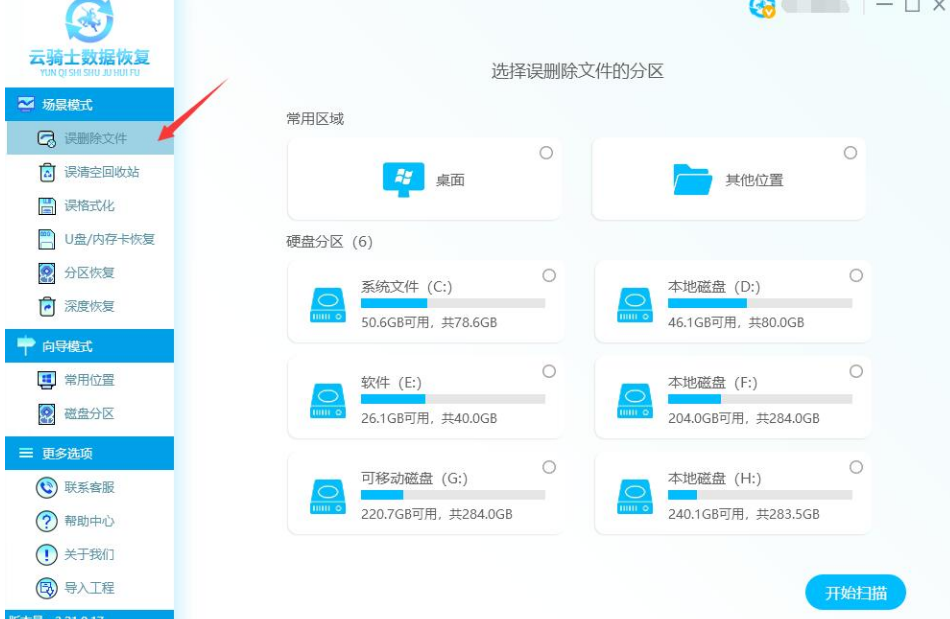 2、选择需要恢复数据的磁盘或分区,点击开始扫描按钮。