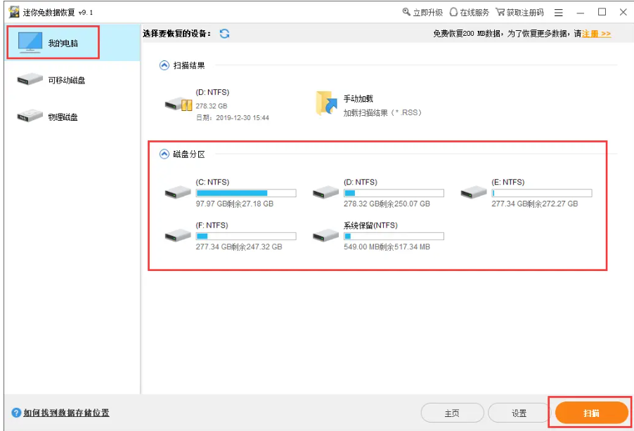 2、进入数据恢复选择界面之后,这里就会显示所有可以进行恢复的分区。小编这里是以D盘为例的,选中之后点击界面右下角【扫描】。