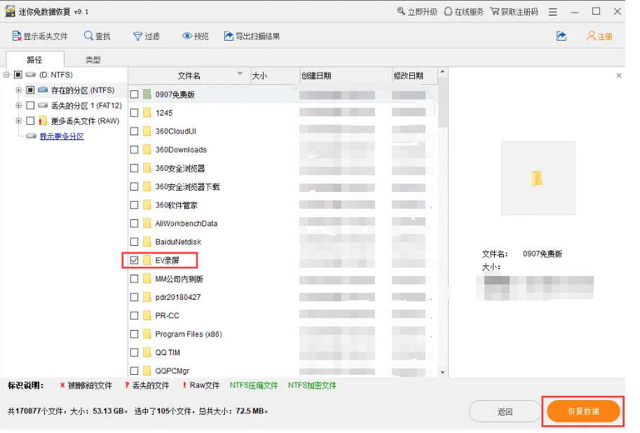 3、等待扫描结束,迷你兔电脑数据恢复工具此时就会显示所选分区的所有丢失数据,例如我们丢失的文件在【EV录屏】中,那么就勾选它,再点击右边的【恢复数据】。
