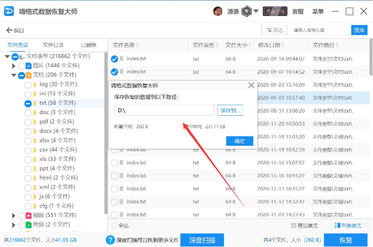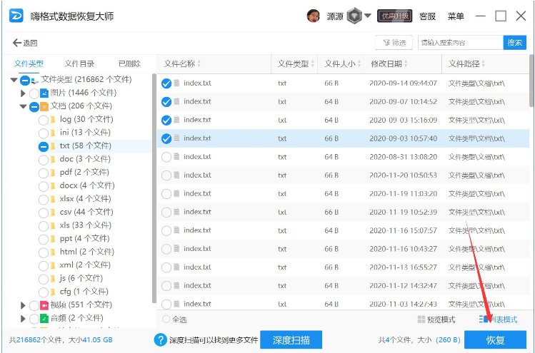 数据扫描完成后,选择需要恢复的文件,点击“恢复”。