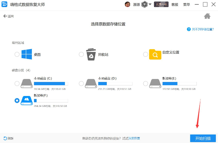 然后选择原文件的存储位置,选好点击“开始扫描”。