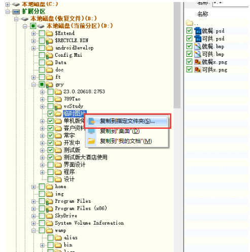 第五步:勾选需要恢复的文件/文件夹,右击所选数据,选择"复制带指定文件夹",设置好文件保存位置即可。