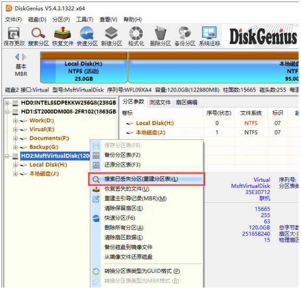 第一步:打开DiskGenius软件,鼠标右键点击丢失分区所在的硬盘,选择"搜索已丢失分区(重建分区表)"进入。