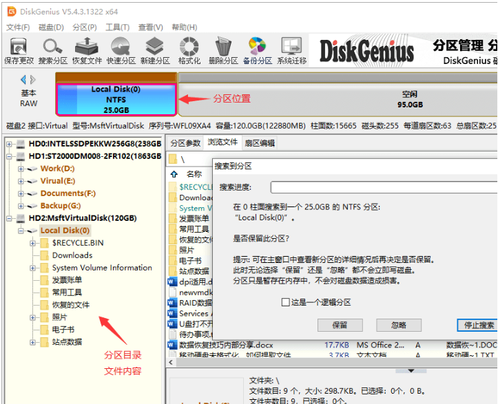 第三步:选择"保留"或是"忽略"。如下图所示。首先预览分区里的数据,若该分区是需要恢复的,就选项"保留",否则点击"忽略"。之后,软件会继续搜索,直到扫描结束。
