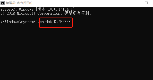 键入:chkdsk 并按Enter键来检查损坏硬盘中的错误