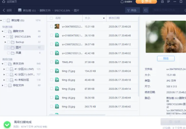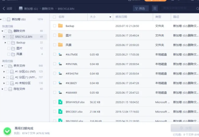 2.耐心等待扫描结束,快速扫描结束后「删除文件」项下的结果优先展示出来,我们可以恢复该项下的任一文件,直到深度扫描结束后,就可以开始恢复其他分类下查找到的文件