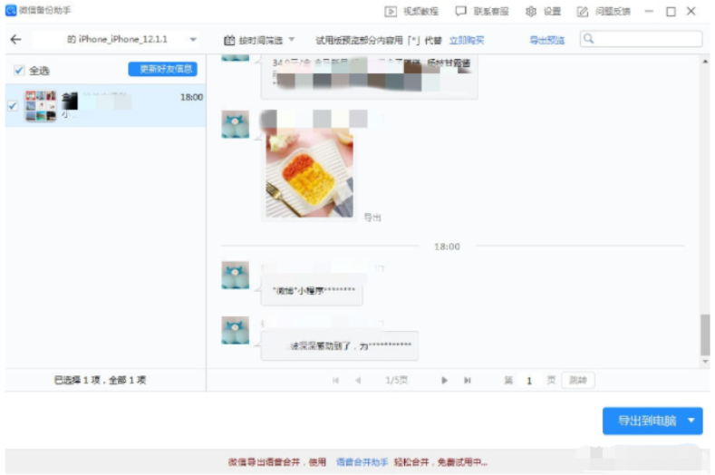 微信备份助手需要先用微信自带的备份功能将聊天记录备份到电脑上,然后读取备份记录,所以可以单独备份单个好友的聊天记录,可以查看图片、视频、语音、表情、链接分享等等,可以将聊天记录全部导出,也可以选择性的单独导出文字、图片、语音或者视频,但这是一款收费软件,最便宜的也要199元/年,不能购买永久使用权,所以成本比较高,土豪随意。