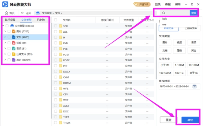 扫描结束之后,文件都显示出来了,大家可以在右上方的搜索框里输入文件的类型等进行筛选,或者在左边位置进行文件类型选择。如图所示: