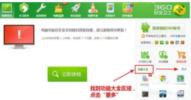 1.打开360安全卫士,找到功能大全,点击“更多”选项。