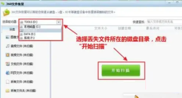3.打开“360文件恢复”功能,选择丢失文件所在的磁盘目录;点击“开始扫描”,等待磁盘扫描结束。如果需要恢复U盘等移动设备的文件,先将U盘连接到电脑上,等待电脑显示“可移动设备”的图标显示,选择需要恢复文件所在的磁盘,点击“开始扫描”即可。