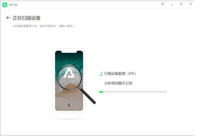 3、点击软件上的新的扫描按钮,此时将会开始扫描并分析手机中的微信聊天记录。