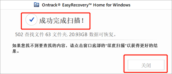 3、软件开始扫描移动硬盘,在图中红框内能够预览文件扫描情况,扫描完成后会弹出“成功完成扫描”窗口,随后点击“关闭”。