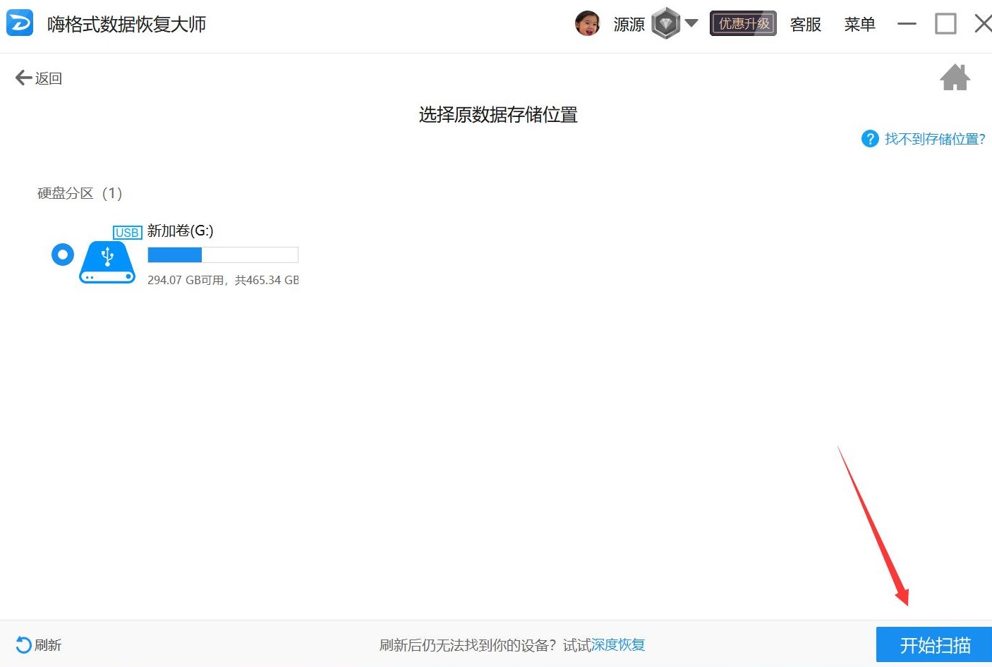 2、选择原文件存储位置,这里点击U盘。选好点击“开始扫描”。
